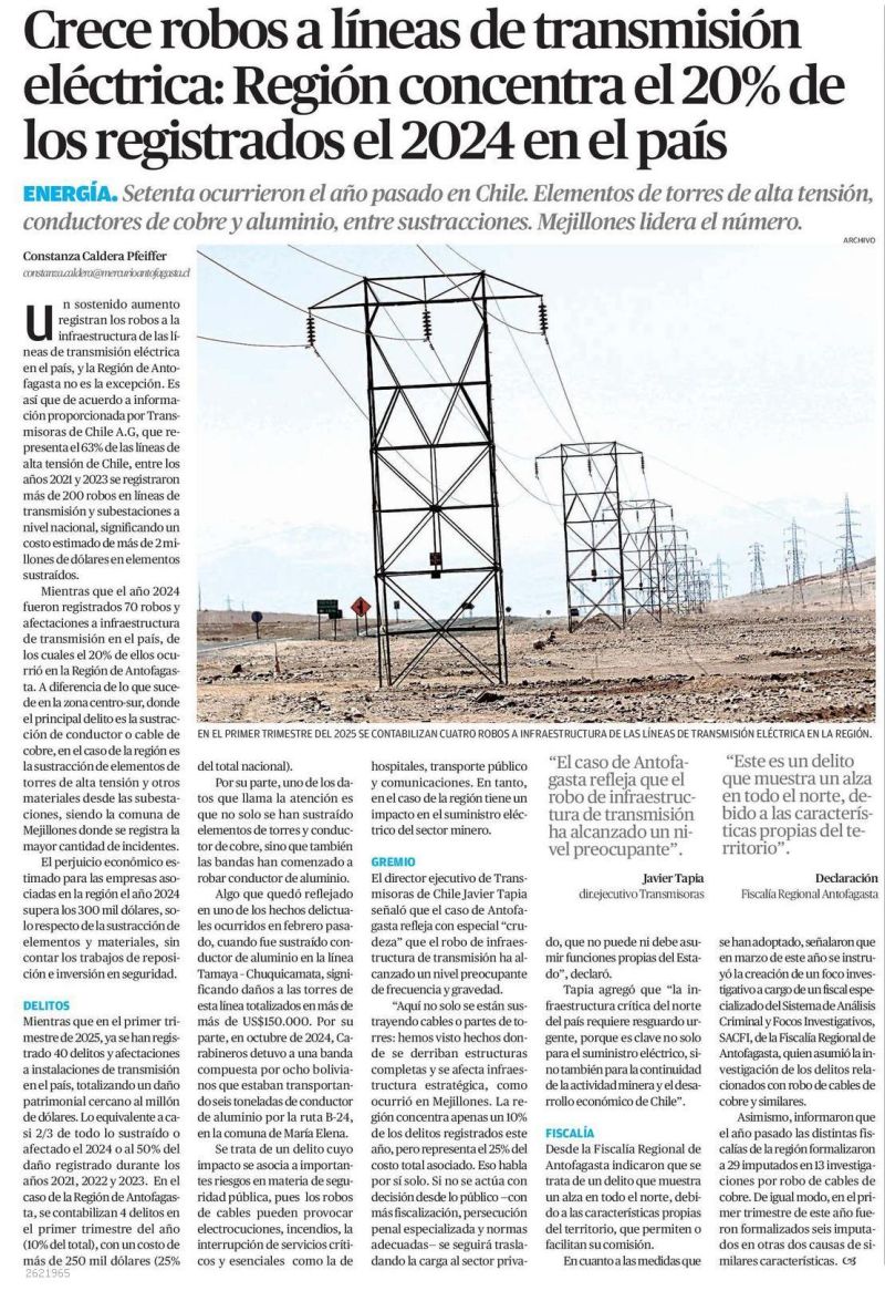 En nota de El Mercurio Antofagasta, se da a conocer que la Región de Antofagasta concentró el 20% de los robos a líneas de transmisión eléctrica a nivel nacional, con más de 300 mil dólares en pérdidas solo por materiales sustraídos. En lo que va de 2025, estos delitos siguen en aumento,...