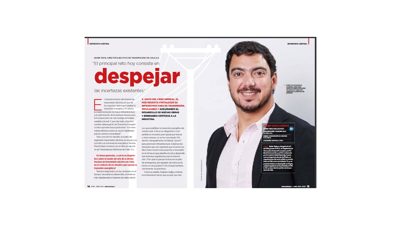 Compartimos la entrevista exclusiva de la edición de junio 2024 realizada a nuestro director ejecutivo, Javier Tapia, por Revista Electricidad. En la entrevista se refiere a los principales retos de la transmisión en nuestro país, el diagnóstico de la infraestructura en la transición energética y las áreas para impulsar para el robustecimiento de la transmisión. […]