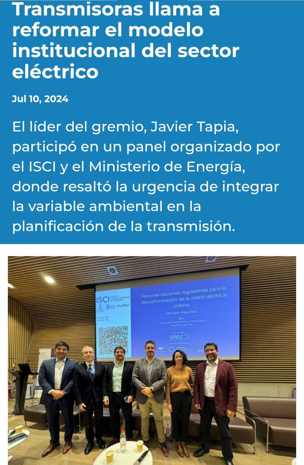 En el marco de la entrega de recomendaciones regulatorias para la descarbonización realizada por el ISCI -Instituto de la Universidad de Chile- al Ministerio de Energía, participamos en un panel de conversación para profundizar sobre las temáticas propuestas. Representados por nuestro director ejecutivo, Javier Tapia, se advirtió la urgente necesidad de revisar el modelo institucional […]