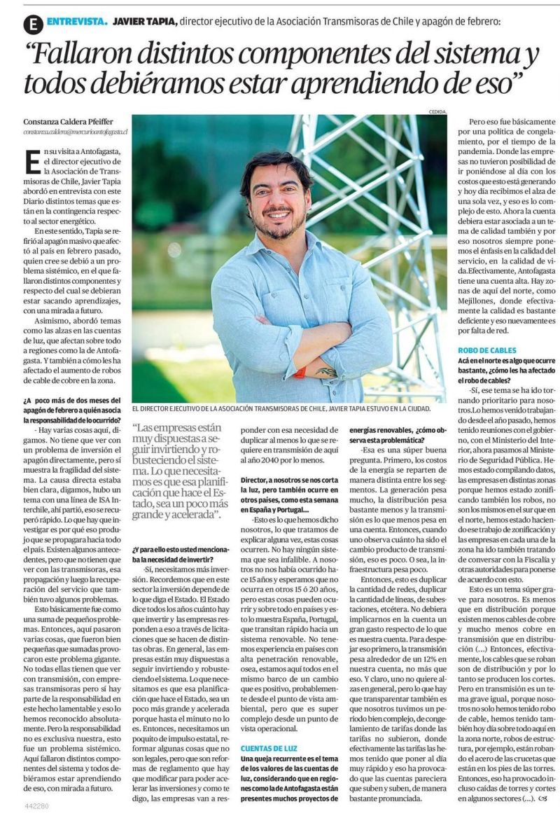 En su reciente visita a Antofagasta, Javier Tapia, director ejecutivo de Transmisoras de Chile, conversó con El Mercurio de Antofagasta sobre los principales desafíos que enfrenta hoy el sistema eléctrico nacional.